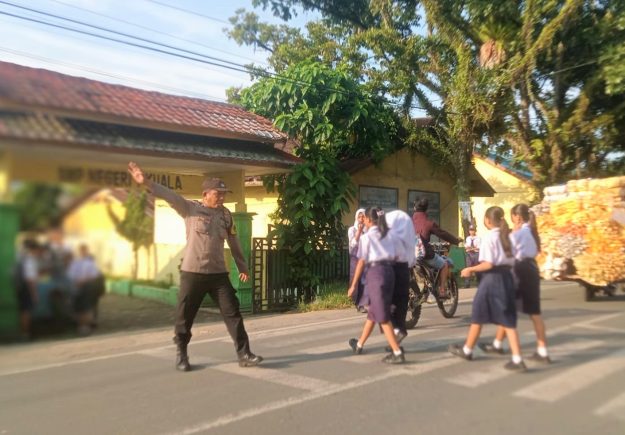 Langkat, MWT – Wujud pelayanan prima Polri kepada masyarakat kembali ditunjukkan oleh Bhabinkamtibmas Polsek Kuala, Aipda Herianta Ginting. Pada Selasa pagi (23/9), ia melaksanakan kegiatan pengaturan lalu lintas (gatur pagi) di depan SMP Negeri 1 Kuala, Kabupaten Langkat.