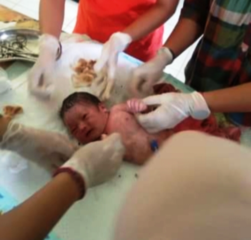 Tidak lama kemudian bayi ditemukan terbungkus kantung merah dengan uri/ ari-ari yang belum terpotong. Bayi itu dilarikan ke klinik di Mulia 3 Kecamatan Nanga Tayap Ketapang dan ditangani mantri – bidan.