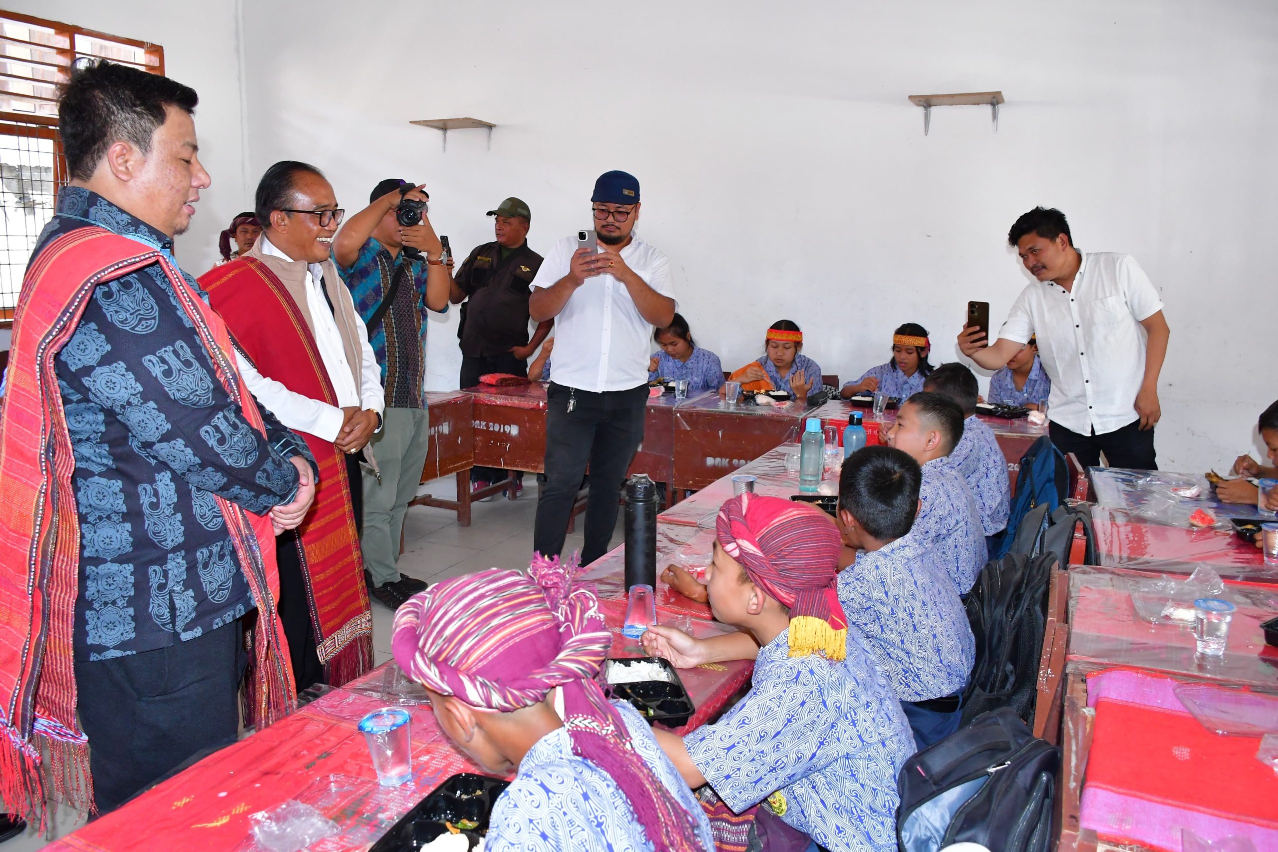 Bupati Samosir, Vandiko T Gultom menyaksikan pemberian makanan bergizi di SMPN 1 Pangururan, Kamis (6/2/2025)