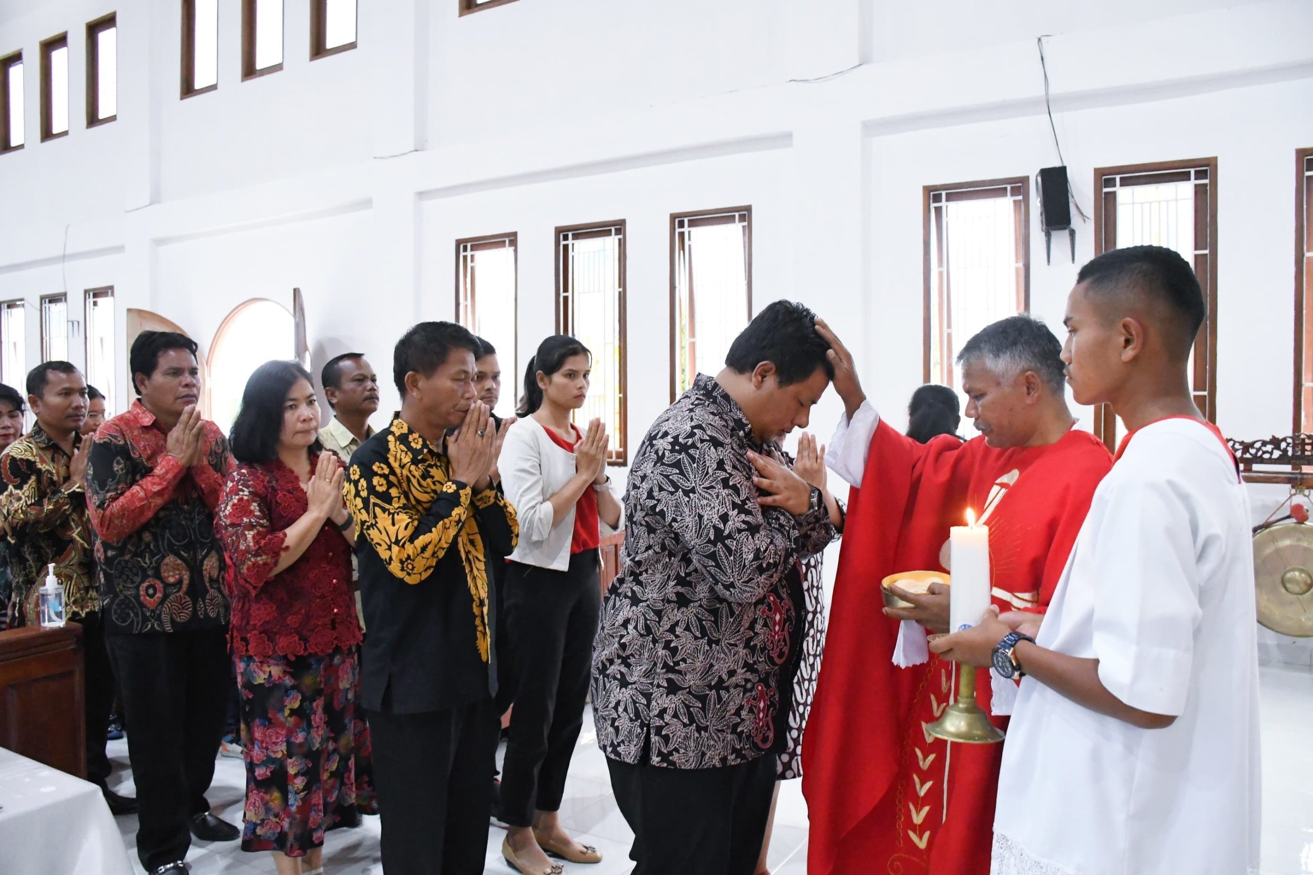 Samosir, MWT – Bupati Samosir  Vandiko Timoteus Gultom mengikuti ibadah Jumat Agung di Gereja Katolik St. Antonio Maria Claret Tomok-Simanindo, Jumat, (29/03/2024).
