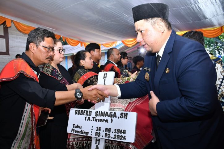 Samosir, MWT – Bupati Samosir, Vandiko T. Gultom, memimpin langsung upacara kenegaraan pemakaman Camat Palipi, Roberd Sinaga, yang digelar di Huta Simanampang, Desa Sinaga Uruk, Kecamatan Nainggolan, Sabtu (7/3/2026).