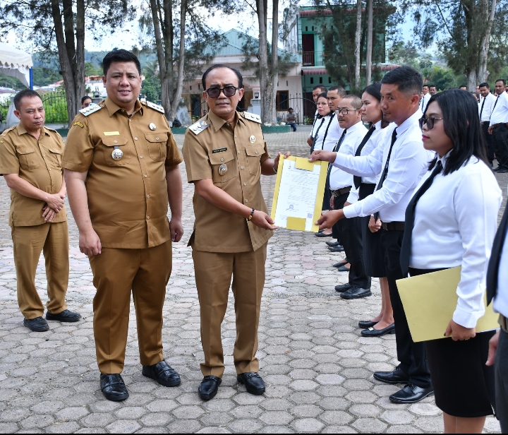 Samosir, MWT – Harapan baru bagi tenaga honorer di Kabupaten Samosir akhirnya terwujud. Sebanyak 803 Pegawai Pemerintah dengan Perjanjian Kerja (PPPK) Paruh Waktu resmi menerima Surat Keputusan (SK) yang diserahkan langsung oleh Bupati Samosir Vandiko T. Gultom, Selasa (13/1/2026), di Halaman Kantor Bupati Samosir.