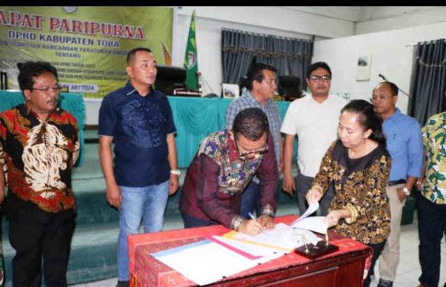 Toba, MWT – Enam Fraksi di DPRD Kabupaten Toba menerima dan penandatanganan Pertanggungjawaban Pelaksanaan APBD Kabupaten Toba Tahun Anggaran (TA)2023 dengan pendapatan sebesar Rp 1.152.229.346.476,86.