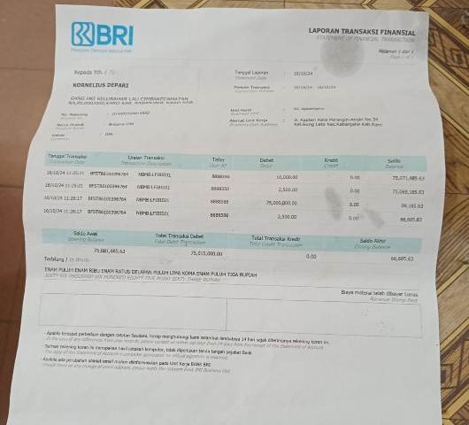 Saya kirim melalui Brimo sebesar Rp 10.000, ditambah biaya admin Rp 2500. Proses trasper sukses. Kemudian saya cek saldo habis sisa Rp66.000  dalam rekening. Seharusnya sisa saldo saya masih ada berkisar Rp 75.000.000.