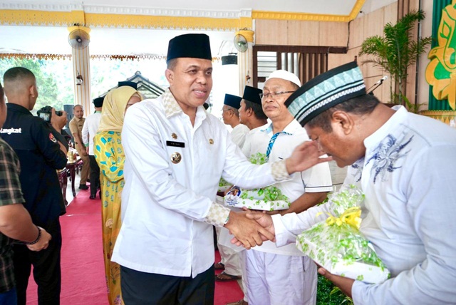 Selanjutnya Penepung Tawaran Jama’ah Calon Haji (JCH) oleh Pj Bupati Langkat bersama Forkopmda, Pj Ketua TP.PKK Kabupaten Langkat dan penyerahan bingkisan kain sarung secara simbolis kepada 12 karom.(Mariani).