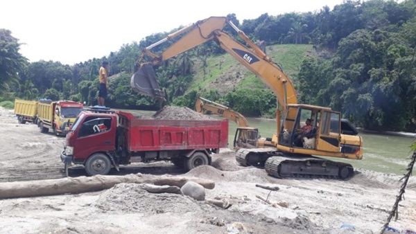 Alat berat mengeruk pasir sungai guna melayani puluhan truk bertonase berat.Masyarakat sekitar tambang pasir sungai hanya memandang kerusakan daerah aliran sungai (DAS).