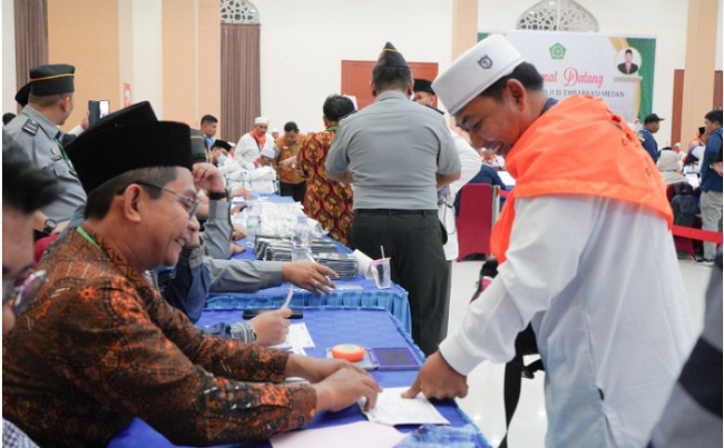 Jemaah Calhaj ini tampak bersemangat dalam mengikuti Pelayanan One Stop Service yang diterapkan Embarkasi Medan.