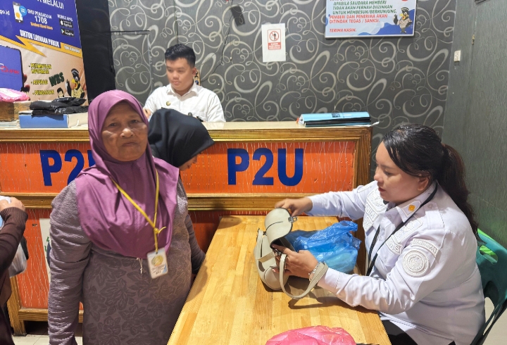 Setelah proses pendaftaran, pengunjung menjalani pemeriksaan badan dan barang bawaan oleh petugas sesuai standar operasional prosedur.