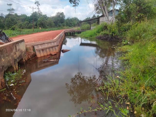Selasa (20/8/2024) pukul 14.23 WIB, tampak bantaran sungai kecil di desa tersebut dialiri air berlumpur dan bertabur minyak. Biota air yang tadinya ramai berenang dan indah dipandang, kini hilang.