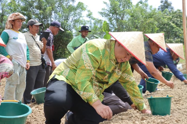 Samosir, MWT – Pemerintah Kabupaten Samosir menunjukkan komitmen dalam mendukung program ketahanan pangan nasional yang merupakan salah satu Asta Cita Presiden RI Prabowo Subianto. Bupati Samosir, Vandiko T. Gultom, turun langsung ke lahan bersama petani menanam bibit bawang putih bantuan Kementerian Pertanian RI di Dusun II Desa Maduma, Kecamatan Simanindo, Kamis (30/04/2026).