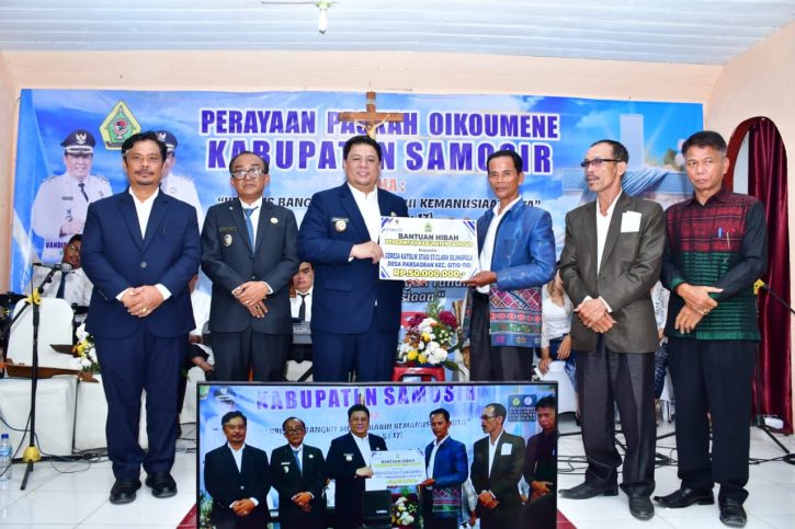 Samosir, MWT –  Perayaan Paskah Oikoumene Kabupaten Samosir Tahun 2026 berjalan khidmat. Didalam gereja katolik St. Clara Silimapuluh Desa Parsaoran Kecamatan Sitio-tio berkumandang lagu pujian dan koor dari denominasi gereja. Gereja kecil yang berada disalah satu pelosok ini menjadi tempat pilihan Bupati Samosir Vandiko T. Gultom untuk merayakan paskah oikumene bersama masyarakat, 23/04/2026.
