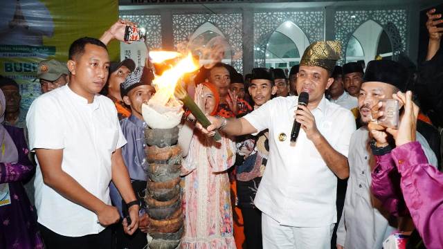 Selanjutnya Pj Bupati Langkat membuka kegiatan tersebut dengan menyalakan obor pawai suluh maryam.
