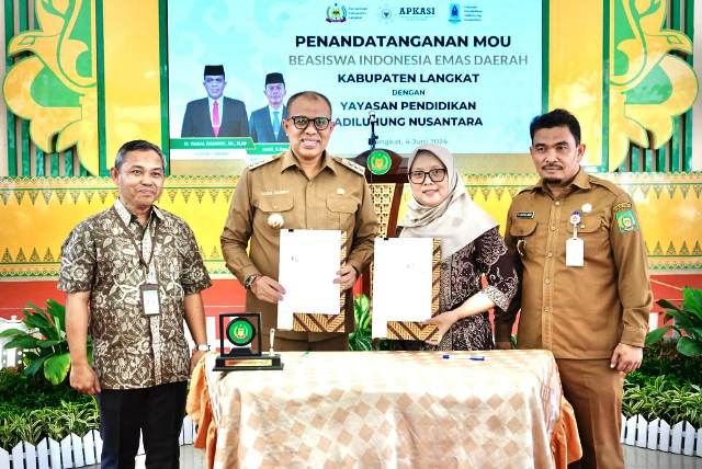 Stabat, MWT – Pj. Bupati Langkat H. M. Faisal Hasrimy, AP., M.AP Tandatangani MoU dan Kerjasama dengan Yayasan Adihulung Pendidikan Nusantara untuk Program Beasiswa Indonesia Emas Daerah (BIE-D) dalam negeri dan luar negeri di Pendopo Jentera Malay Rumah Dinas Bupati, Selasa (04/06/2024).