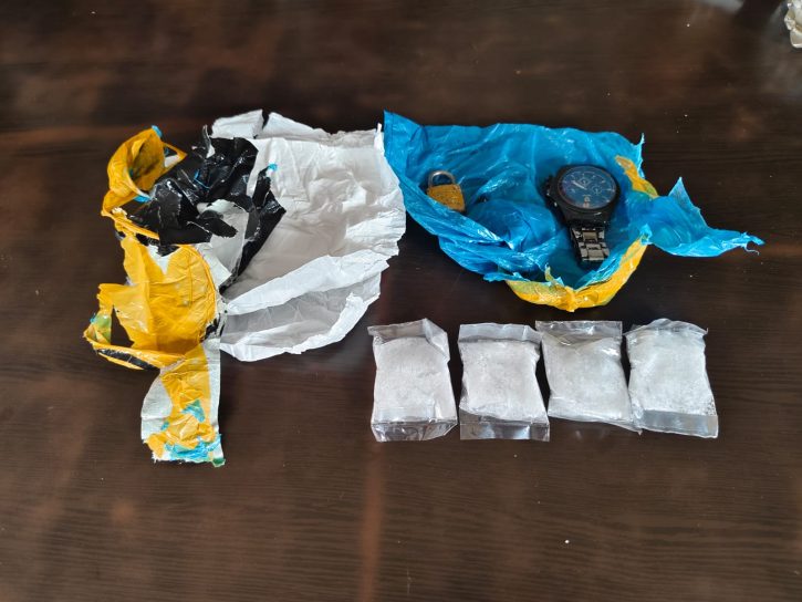 Setelah dibuka, bungkusan tersebut berisi empat paket sedang serbuk putih berbentuk kristal yang diduga merupakan narkotika jenis sabu. Selain itu, ditemukan pula sebuah jam tangan dan gembok kecil di dalamnya.