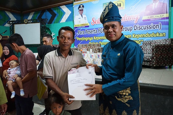 Di acara FGD ini H.M.Faisal Hasrimy menyerahkan dokumen adminduk dalam program “Denting” Serta pemberian tambahan makanan untuk balita kepada keluarga stunting.(Mariani).