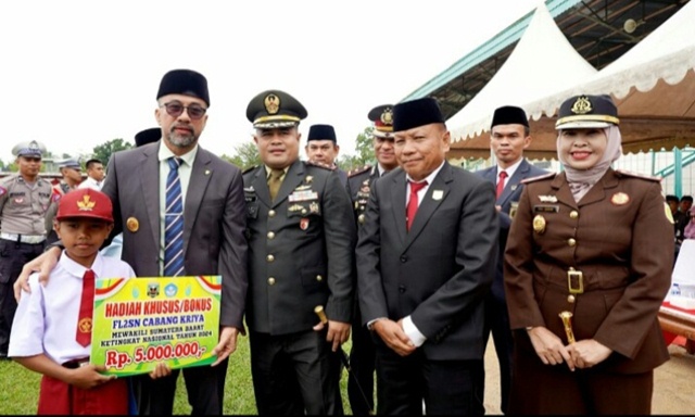 Pjs.Bupati juga menyerahkan Bonus Rp 5 juta kepada Fahira Luthfina Randiathar murid SDIT Kautsar Ilmi yang berhasil mewakili Sumbar dalam cabang renang O2SN tingkat Nasional dan Varis Antoni murid SDN 25 Padang Laweh mewakili Sumbar cabang Kriya /Anyaman dalam FL2SN tingkat Nasional.