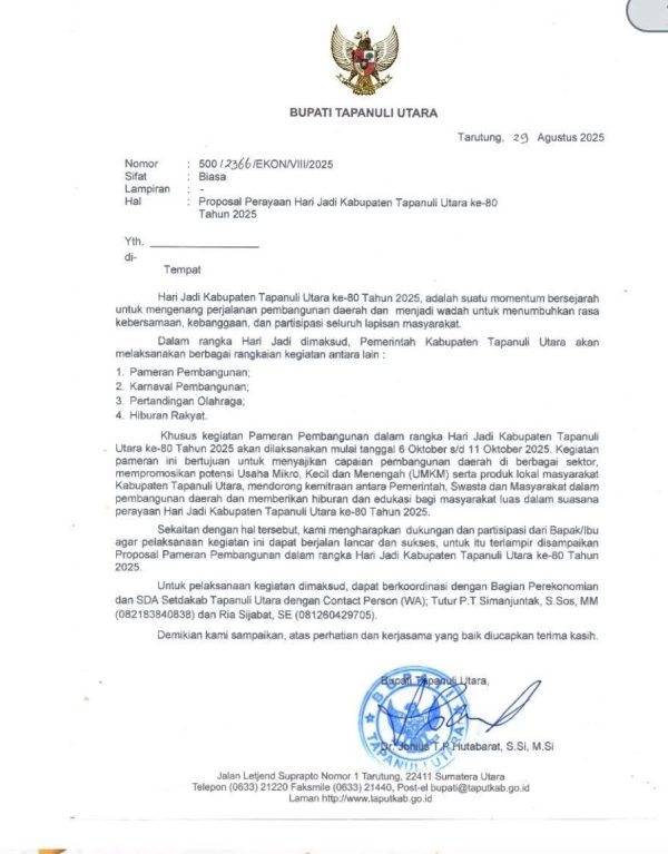 Tarutung, MWT – Pelaksanaan perayaan HUT Kabupaten Tapanuli Utara (Taput) ke-80 menuai sorotan publik setelah munculnya proposal permohonan partisipasi yang disebarkan panitia kepada berbagai pihak. Praktik ini dianggap sebagai terobosan baru, namun juga menimbulkan tanda tanya mengenai transparansi dana yang terkumpul.