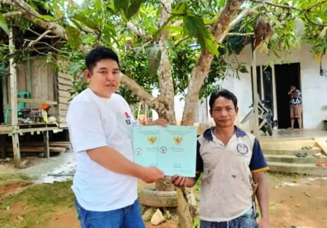 Ketapang, MWT – Kepala Desa Batu Payung 2 Kecamatan Marau Kabupaten Ketapang, Titus menyerahkan sertifikat Prona kepada warganya secara gratis baru-baru ini.