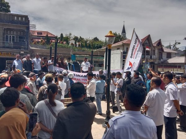 Taput, MWT – Ribuan massa dari mitra kerja Toba Pulp Lestari (TPL) menggelar aksi unjuk rasa di depan Gedung DPRD Tapanuli Utara (Taput), Rabu (29/10/2025). Massa menuntut agar Ephorus Huria Kristen Batak Protestan (HKBP), Pdt. Viktor Tinambunan diganti.
