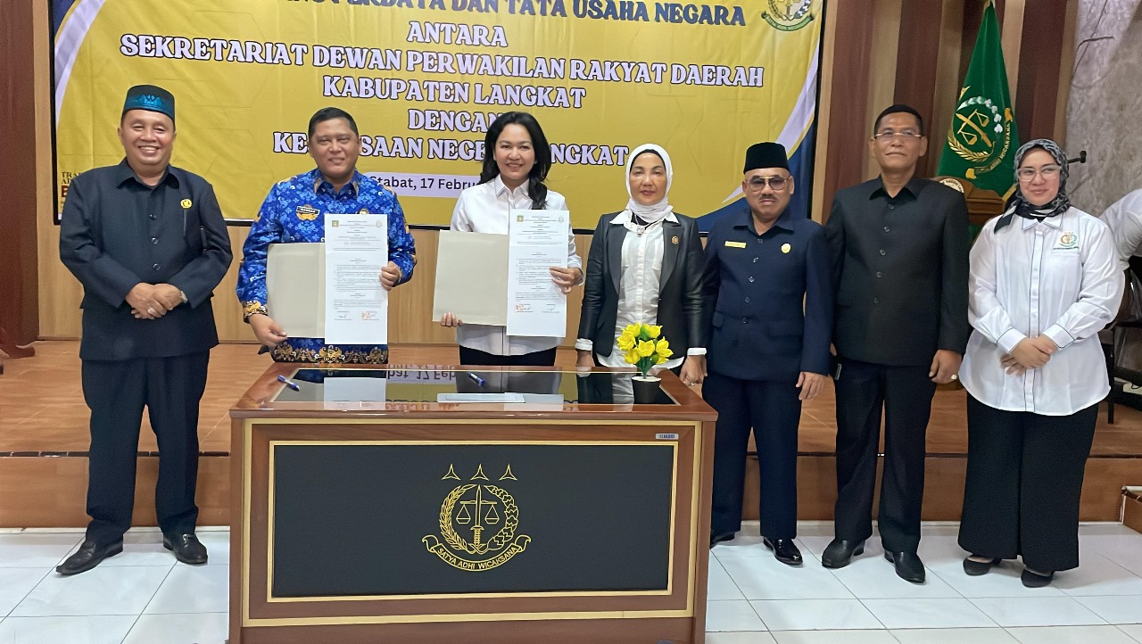 Langkat, MWT – Sekretariat DPRD Kabupaten Langkat bersama Kejaksaan Negeri (Kejari) Langkat menandatangani perjanjian kerja sama dalam penanganan masalah hukum di bidang Perdata dan Tata Usaha Negara (Datun). Penandatanganan kesepakatan ini dilakukan oleh Sekretaris DPRD Kabupaten Langkat, Drs. Basrah Pardomuan, dan Kepala Kejari Langkat, Yuliarni Appy, S.H., M.H. Acara tersebut turut disaksikan oleh Pimpinan DPRD Langkat dan Ketua-Ketua Fraksi DPRD Langkat di ruang aula kantor Kejari Langkat.