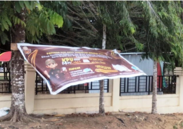 Marau, MWT – Spanduk KPU Ketapang terlihat unik. Selain dilengketkan diantara dua pohon kayu pinggir jalan posisinya di halaman kantor camat Marau Kabupaten Ketapang. Saat dipantau, spanduk dari  baha MMT ini, bagaikan layang – layang karena tertiup angin. ” Anggarannya jelas, kenapalah pemasangannya seperti ini. Informasinya cukup penting yakni soal pemilihan gubernur dan wakil gubernur Kalimantan Barat serta Bupati dan Wakil Bupati Kabupaten Ketapang tahun 2024, ” ujar pelintas jalan sambil geleng kepala ( Jajir ).