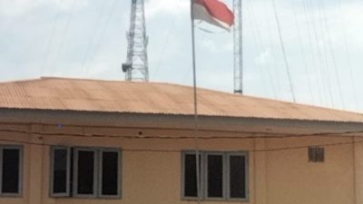 Manis Mata, MWT— Sebuah bendera Merah Putih sobek terlihat tetap berkibar di halaman Kantor Siaga…