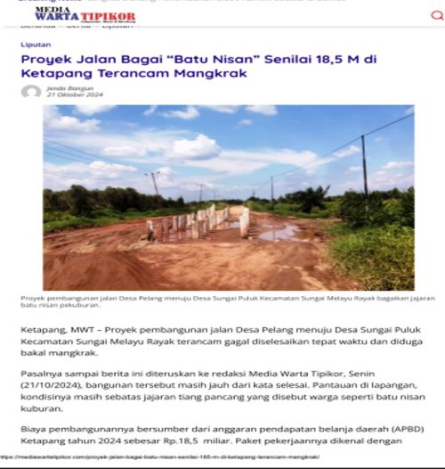 Proyek pembangunan jalan Desa Pelang menuju Desa Sungai Puluk Kecamatan Sungai Melayu Rayak bagaikan jajaran “batu nisan” pekuburan. Meminjam istilah yang disampaikan warga terdekat.