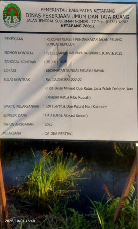 Dalam plank tertulis proyek ini dari Dinas Pekerjaan Umum Dan Tata Ruang Pemkab Ketapang. Nama paket rekonstruksi jalan, Jalan Pelang – Sungai Kepuluk. Nomor kontrak P/921/PPK.1-APBD/DPUTR.B-600.1.9.3/IV/2023 senilai Rp 3.691.361.000 dengan sumber dana APBD Kabupaten Ketapang. Lokasinya di Kecamatan Matan Hilir Selatan, masa pelaksanaan 180 hari kalender dikerjakan kontraktor CV Aneka Sari Alam sejak 28 April 2023.