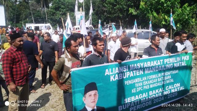 Madina, MWT – Selesai melaksanakan sholat Jumat (26/4/2024), aliansi masyarakat pemilih PKB Kabupaten Mandailing Natal mengawal pengembilan formulir pendaftaran Ivan Iskandar Batubara ke kantor DPC PKB Kab. Madina sebagai bakal calon Bupati Mandailing Natal periode 2024-2029.