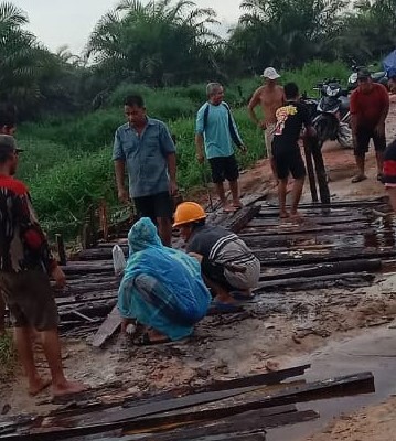 Jalan yang menjadi urat nadi mobilitas masyarakat itu sempat terputus akibat banjir. Begitu air berangsur surut, warga langsung bergerak cepat membangun jembatan manual menggunakan kayu sisa olahan warga. Pengerjaan dilakukan swadaya tanpa bantuan pihak mana pun.